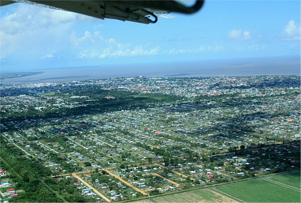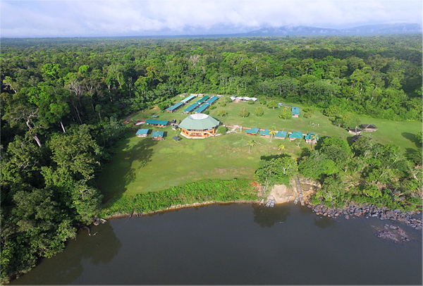 Hintergrund ist der Essequibo-River zu sehen, der das Gebiet nach der Trockenzeit regelmäßig flutet.