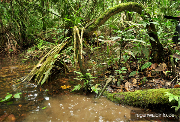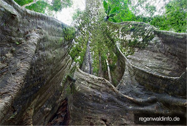 Blätterdach über uns aus, Bromelien hängen von den Ästen, die meterhohen Brettwurzeln schlängeln sich in alle