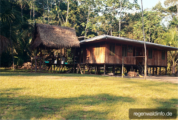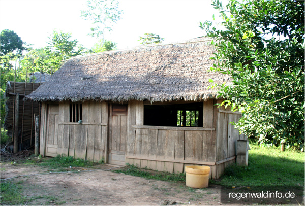 Tage mein Zuhause sein wird: ein schiefes Gebälk, darauf ein Dach aus Palmblättern. Als Urwaldcamp geht es nur