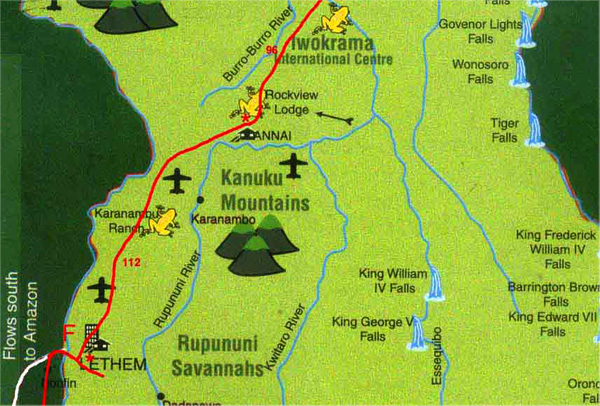 ausladenden Schleifen, in denen sich der Rupununi River durch den Südwesten Guyanas schlängelt, dauerte die