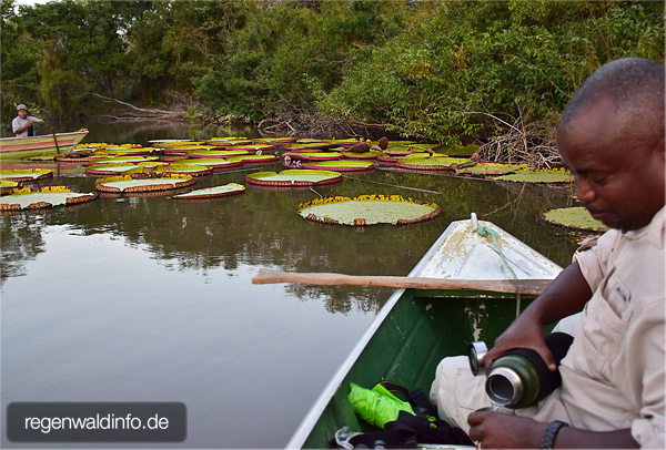 in den ganz vom Fluss getrennten Tümpeln hinter dem Uferwald gibt: Die Riesenseerose Victoria amazonica, der